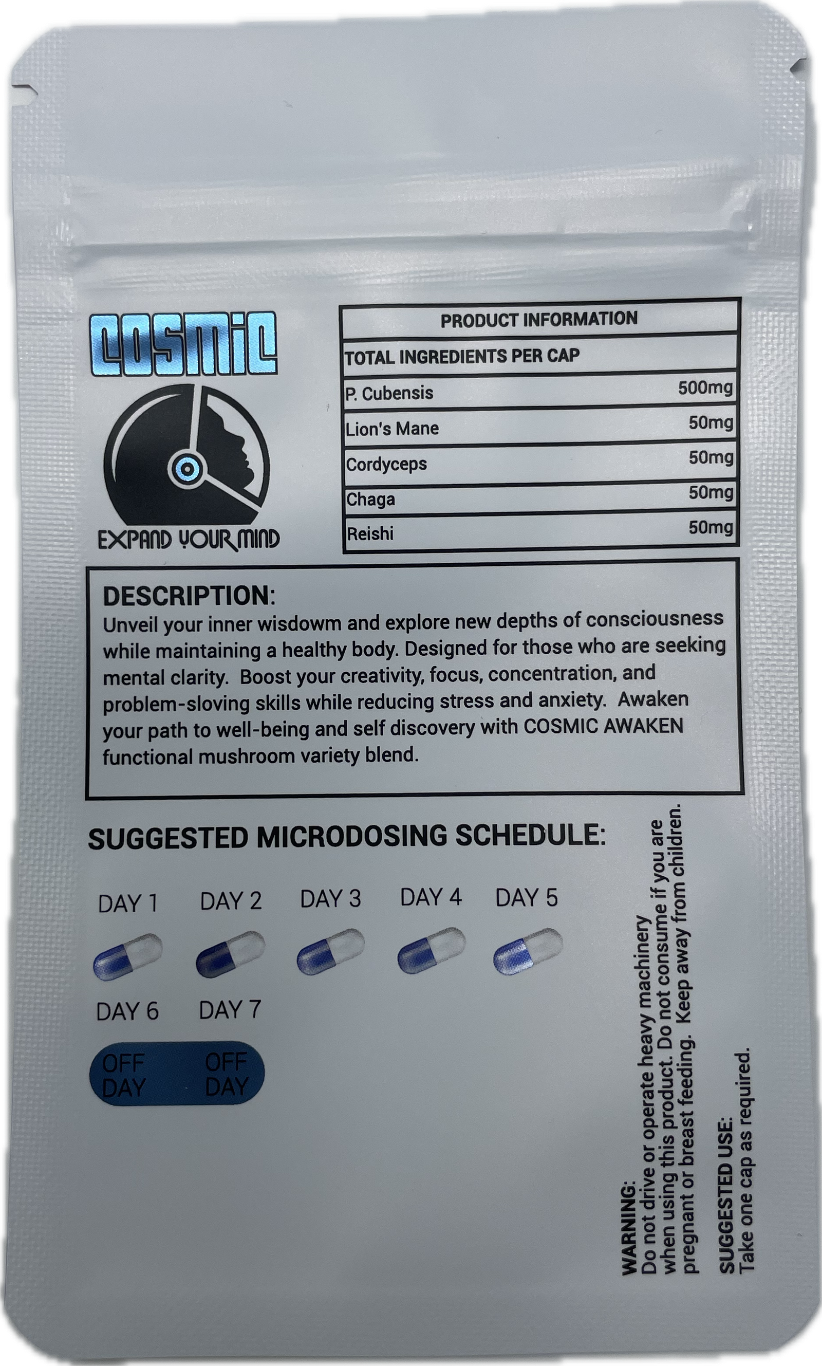 The Cosmic Active Blend represents a remarkable fusion of elements designed to facilitate the awakening of higher consciousness and wisdom. Central to this blend is a carefully curated mix of botanical ingredients, each contributing uniquely to the integral goal of enhancing mental clarity and focus. The proprietary 500mg Cosmic active blend is fundamental in promoting profound insights that elevate awareness and deepen understanding of one’s inner self and the universe at large.